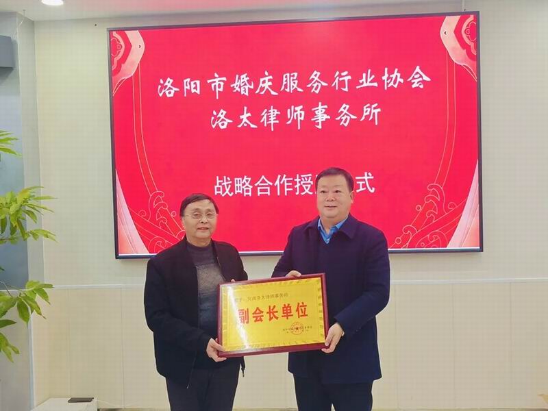 仪式现场,洛阳市婚庆服务行业协会会长王汉民代表协会为洛太律所颁发“副会长单位”证书及牌匾,正式确立双方战略合作伙伴关系;同时,为强化行业法律保障,协会特聘任洛太律所高 级合伙人、党支部书记王森为法律顾问,为婚庆行业高质量发展注入专业法治动能。此次合作既是协会对洛太律所专业实力的高度认可,更是双方深化联动、共促行业健康发展的重要举措,为后续法律服务落地与行业合规建设奠定了坚实基础。
